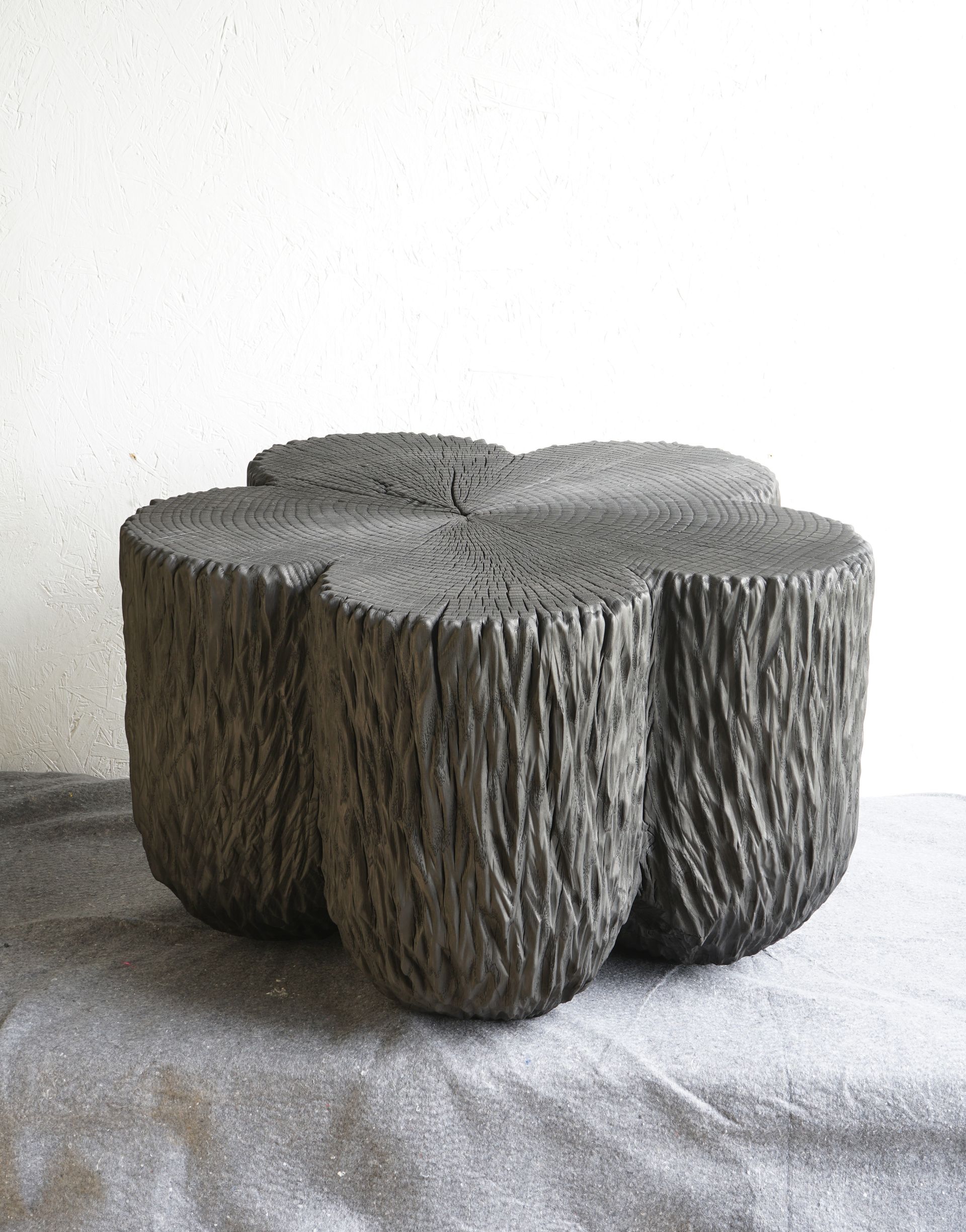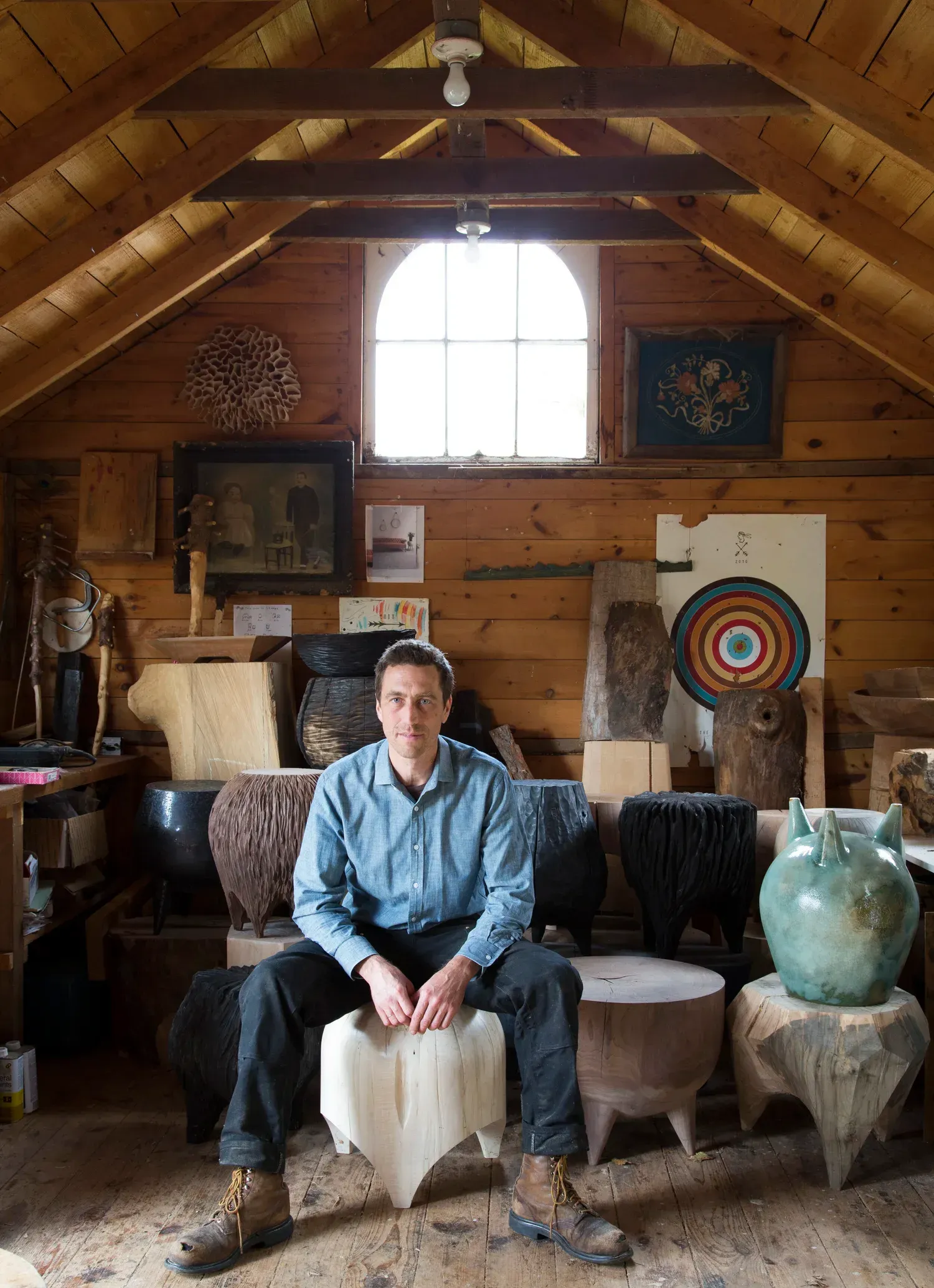 He has based himself in a rural community that he has said affords him the space and solitude to produce the sculptures and furniture he creates with hand and power tools — typically small tables and stools that are cut, shaped and fired out of sections of locally-sourced logs of maple, walnut and other hard woods of varying colors and grains. His “stumps,” as they are often called, are sumptuous objets d’art that with their various textured and polished forms... Each piece dramatically reveals its own personality, which is viscerally gratifying to the senses... Kinsella uses all kinds of locally sourced and salvaged wood. By salvaged he means that, if he can find wood through a tree service or from a place where the logs are just going to be used for firewood, “that’s my favorite to use, because it’s rescue wood; I mean, the most pleasing discovery for me is wood that was just in a firewood pile or what the tree service was going to put in their log dump,” — though he refrains from calling himself a “dumpster diver” for every piece he creates. Repurposing salvaged wood is what he considers an homage to nature.’- Chris Hartman / Upstate Diary
