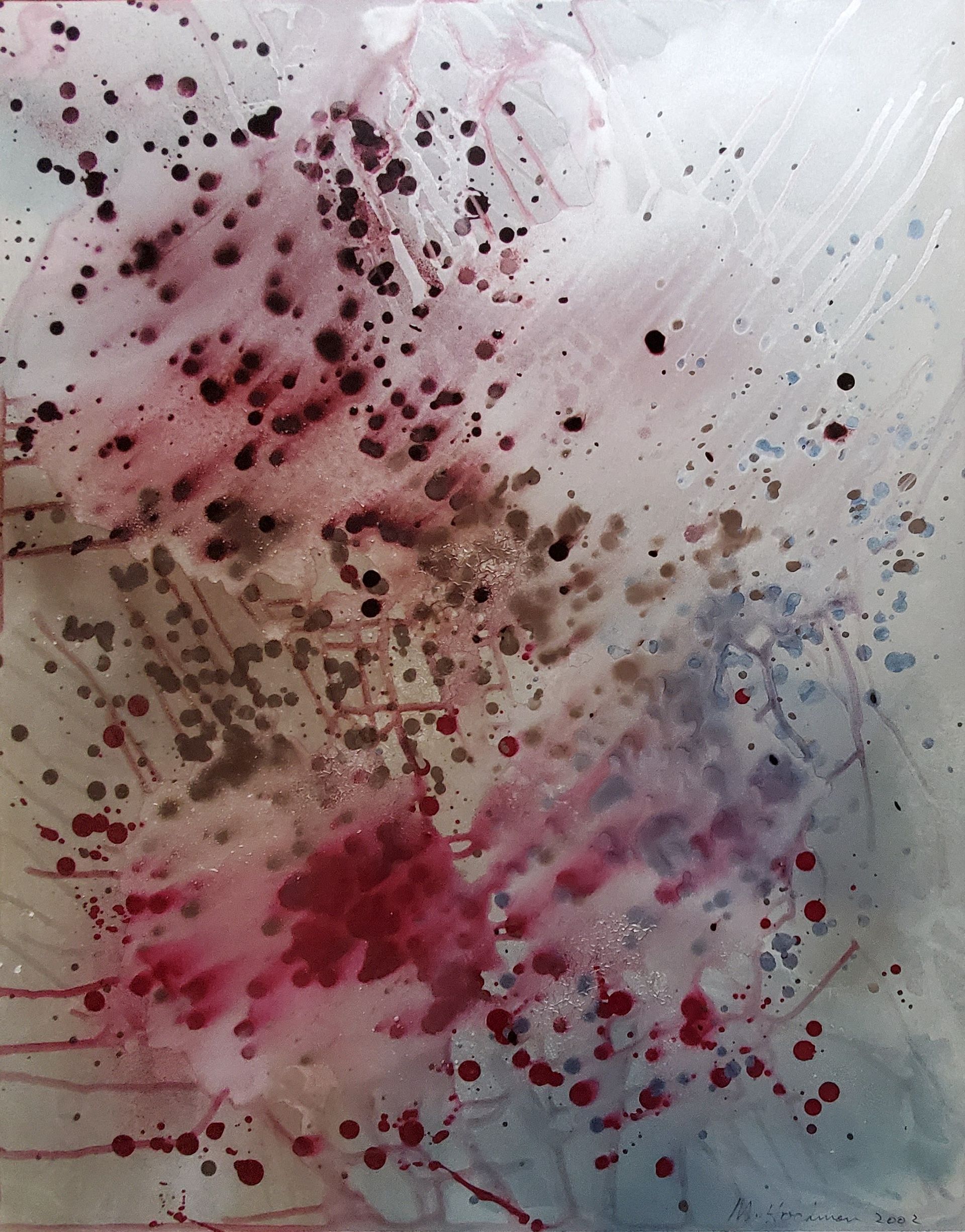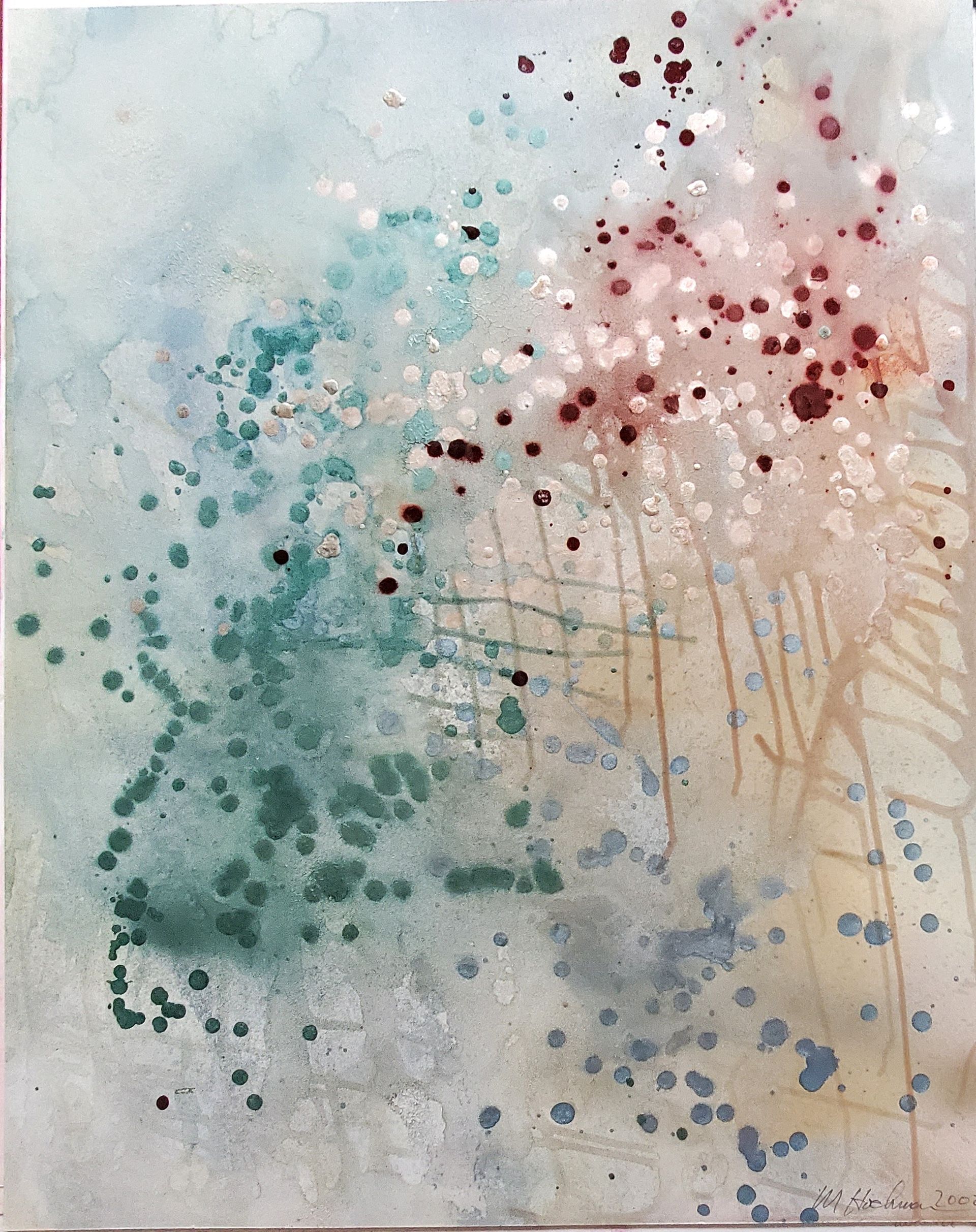 “My work has always been process-oriented, and I let materials, chance and the moment direct the outcome.,” says Murray Hochman. The “dot” paintings in this exhibition, from 2002-2003, were no exception: they resulted from the accidental sputtering of cold aerosol paint cans in an unheated barn.