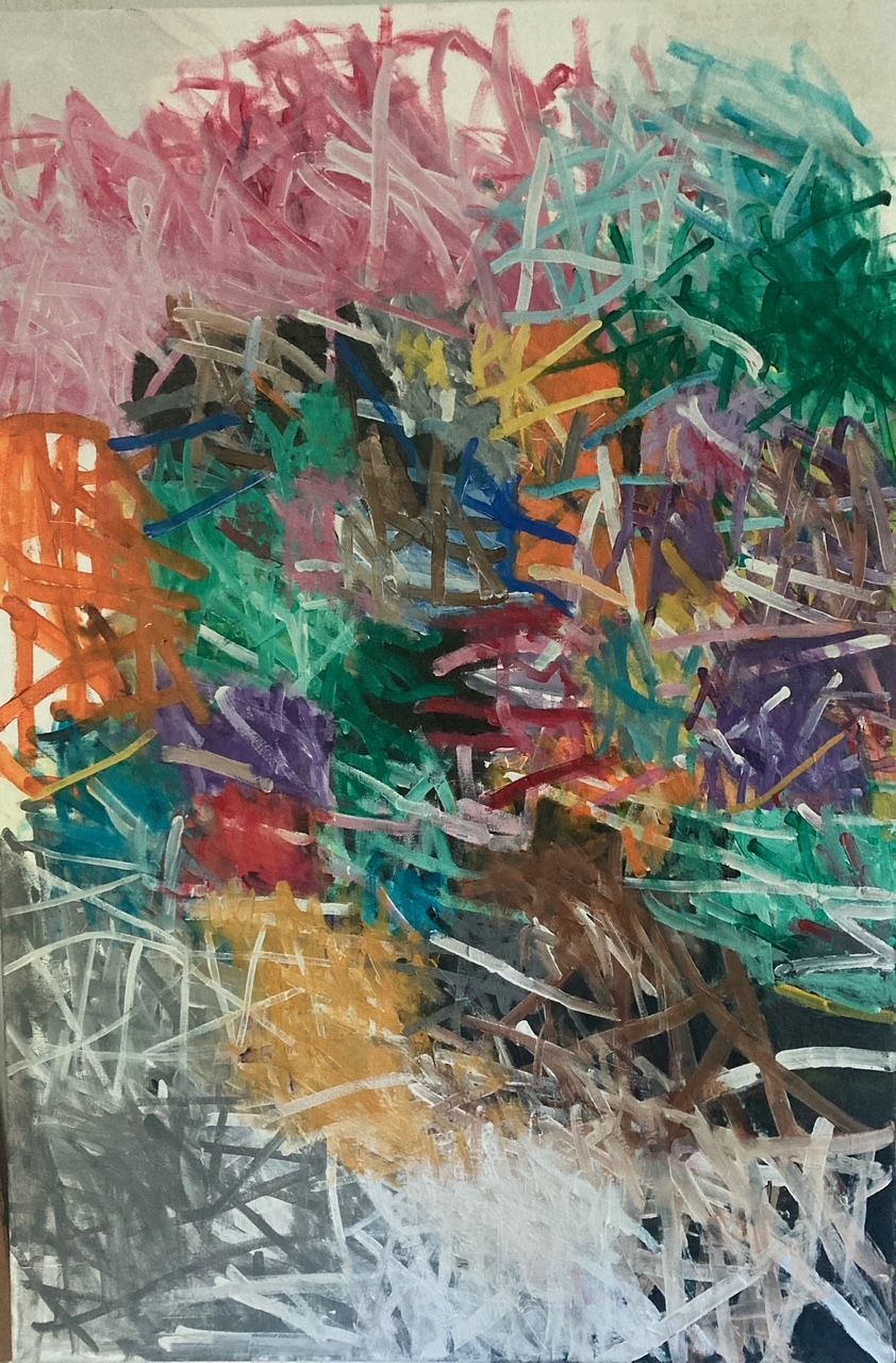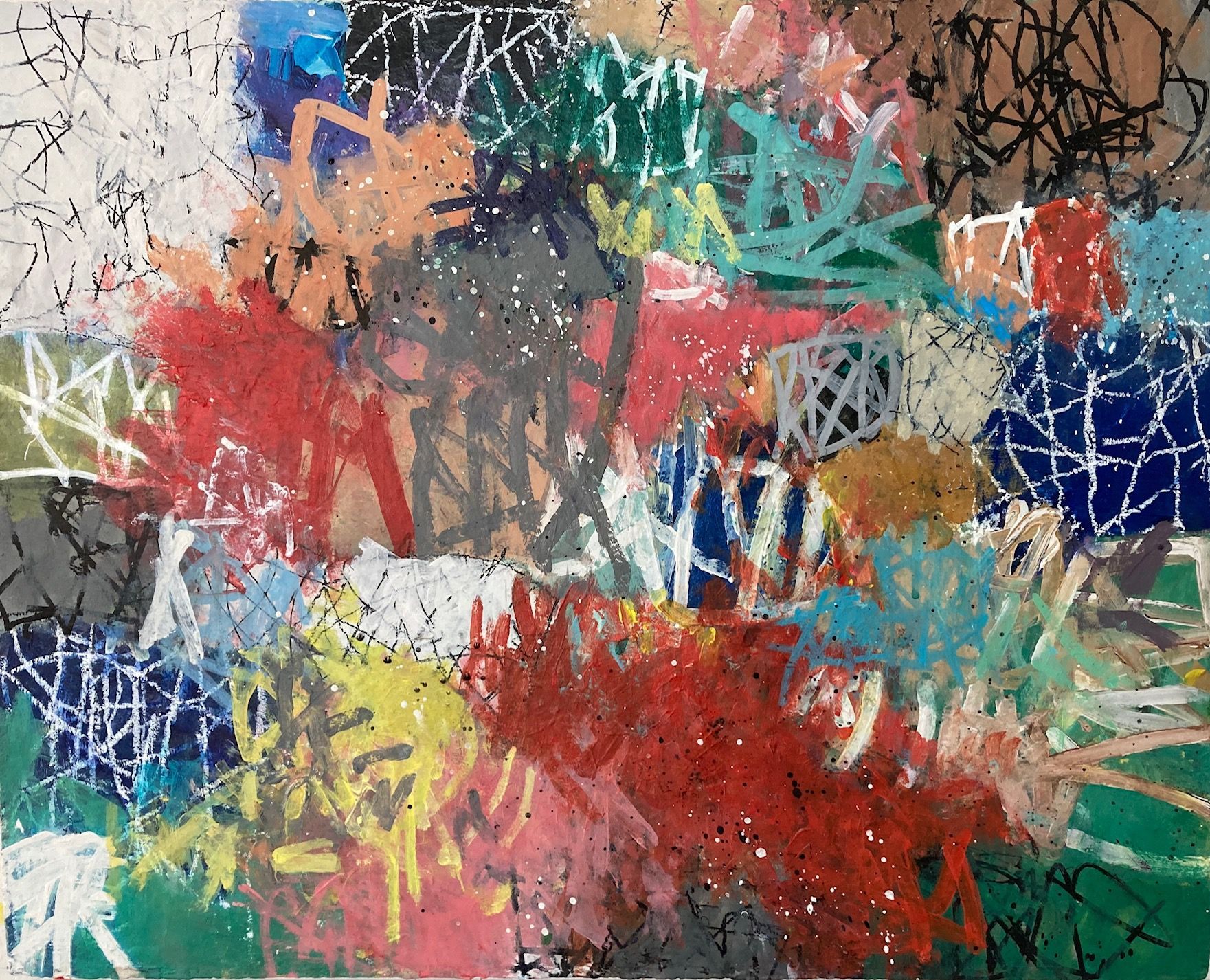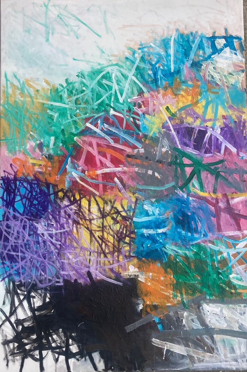 I usually begin a painting with loose, uncontrolled gestural mark making and then start building up the canvas with layers of paint. I get fully immersed in the tactile engagement of materials as well as the physicality of applying energetic strokes and marks to the canvas; each one a response to what came before. The painting keeps evolving as paint is applied, removed, reapplied and elements are constructed and deconstructed, as I create a dance between the visible and the obscured until the proper sensibility is achieved. Finally, some deliberate intention is necessary in the later stages of the painting to harness in some of the wildness and provide whatever shape or structure the composition may need.”