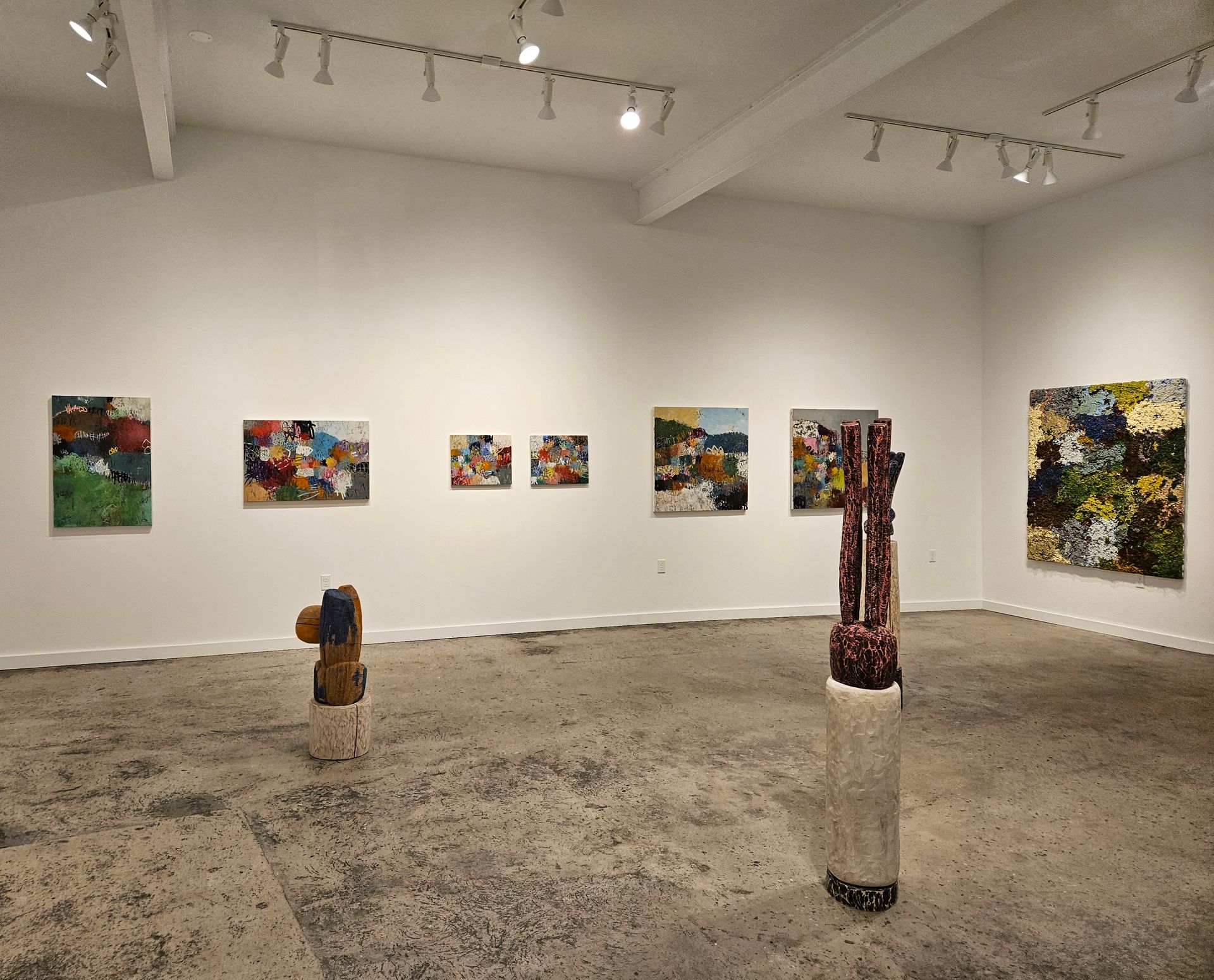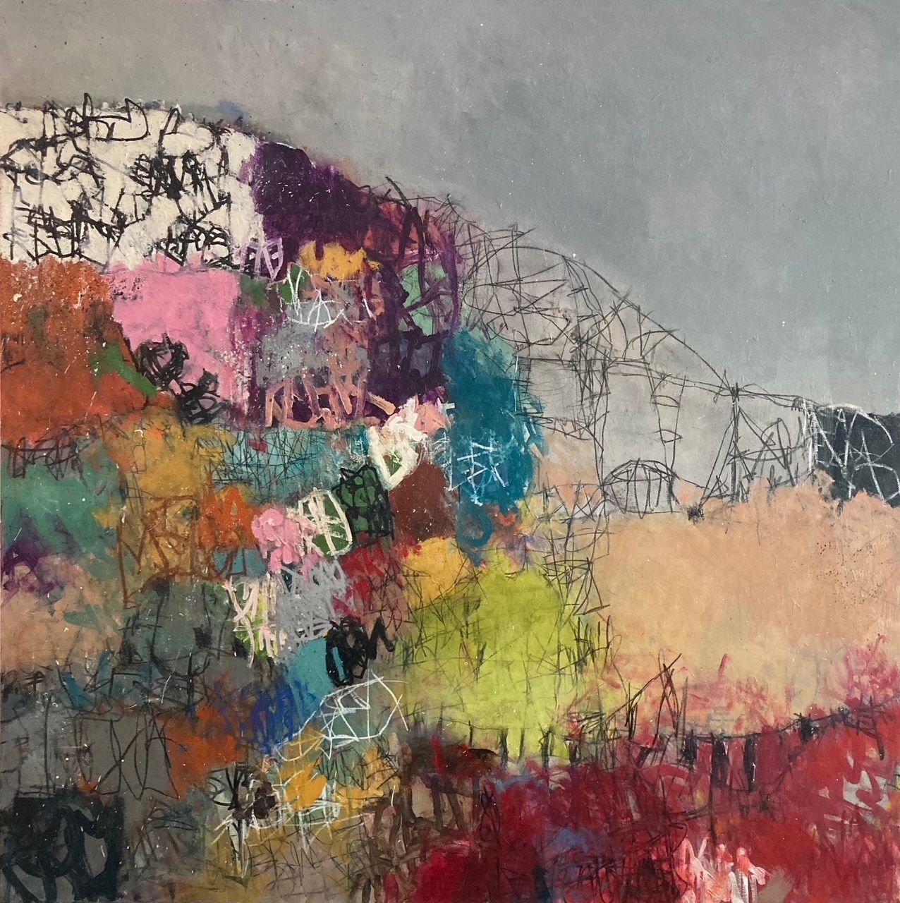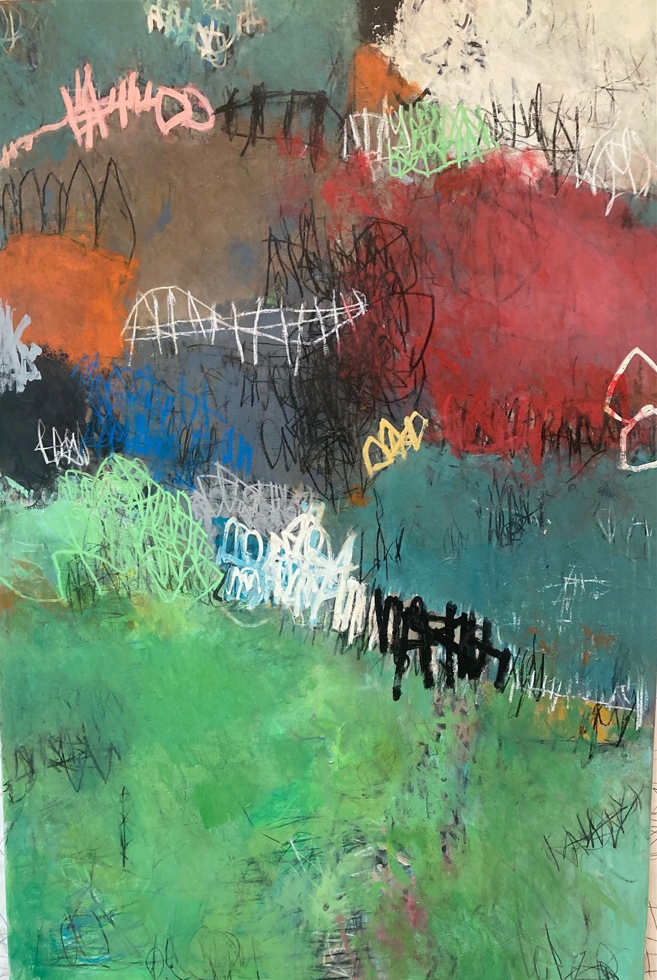 I usually begin a painting with loose, uncontrolled gestural mark making and then start building up the canvas with layers of paint. I get fully immersed in the tactile engagement of materials as well as the physicality of applying energetic strokes and marks to the canvas; each one a response to what came before. The painting keeps evolving as paint is applied, removed, reapplied and elements are constructed and deconstructed, as I create a dance between the visible and the obscured until the proper sensibility is achieved. Finally, some deliberate intention is necessary in the later stages of the painting to harness in some of the wildness and provide whatever shape or structure the composition may need.”