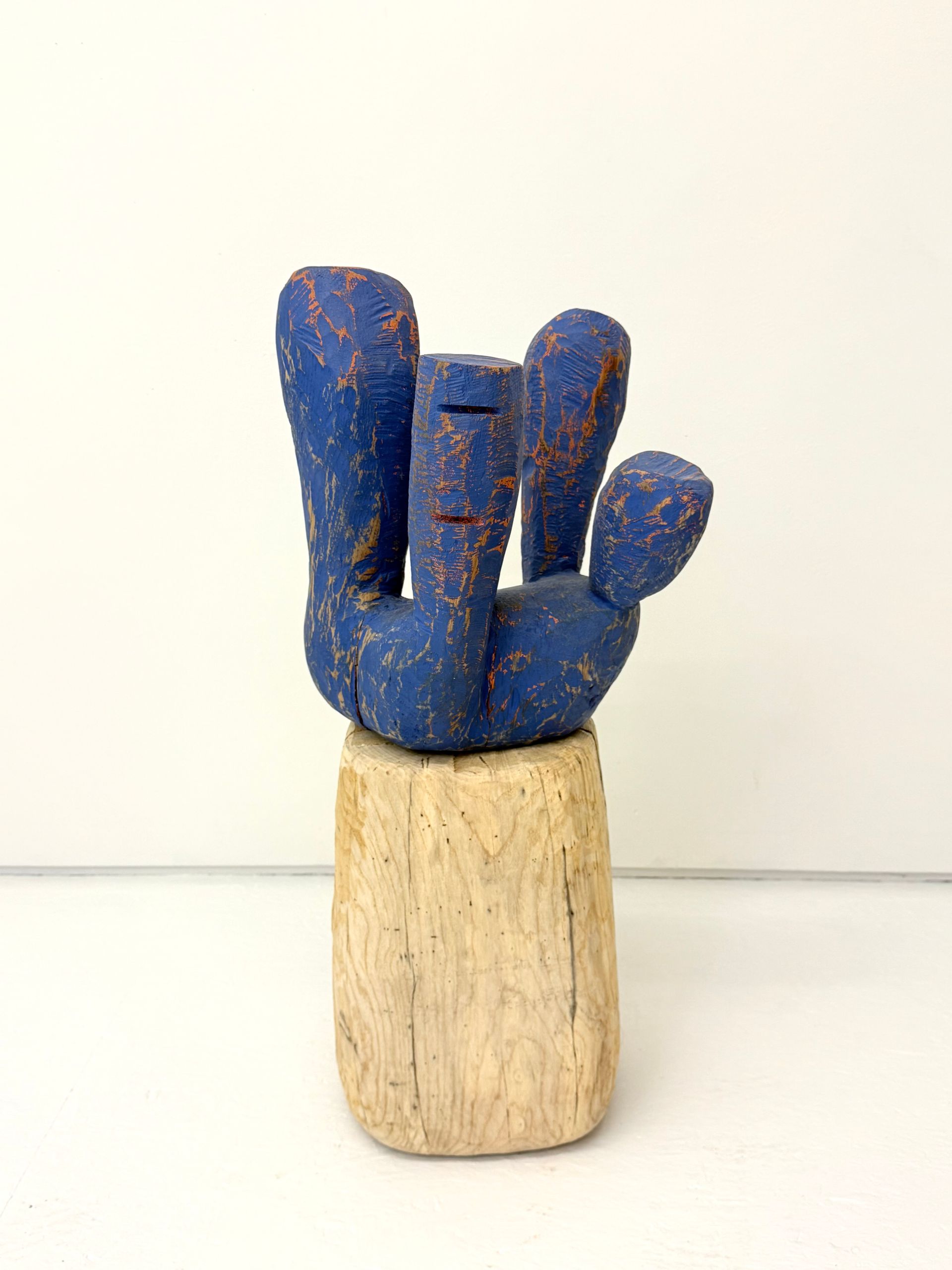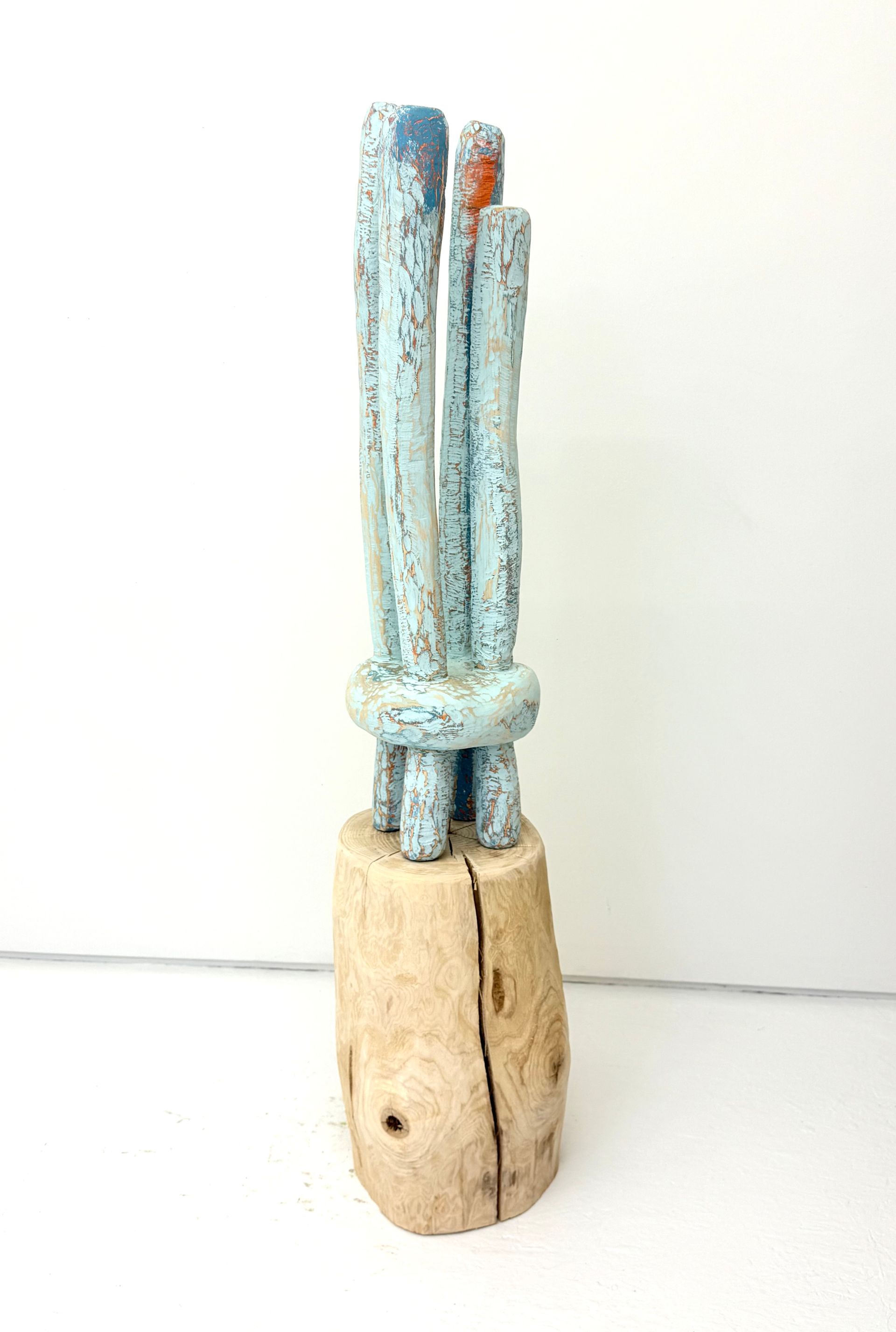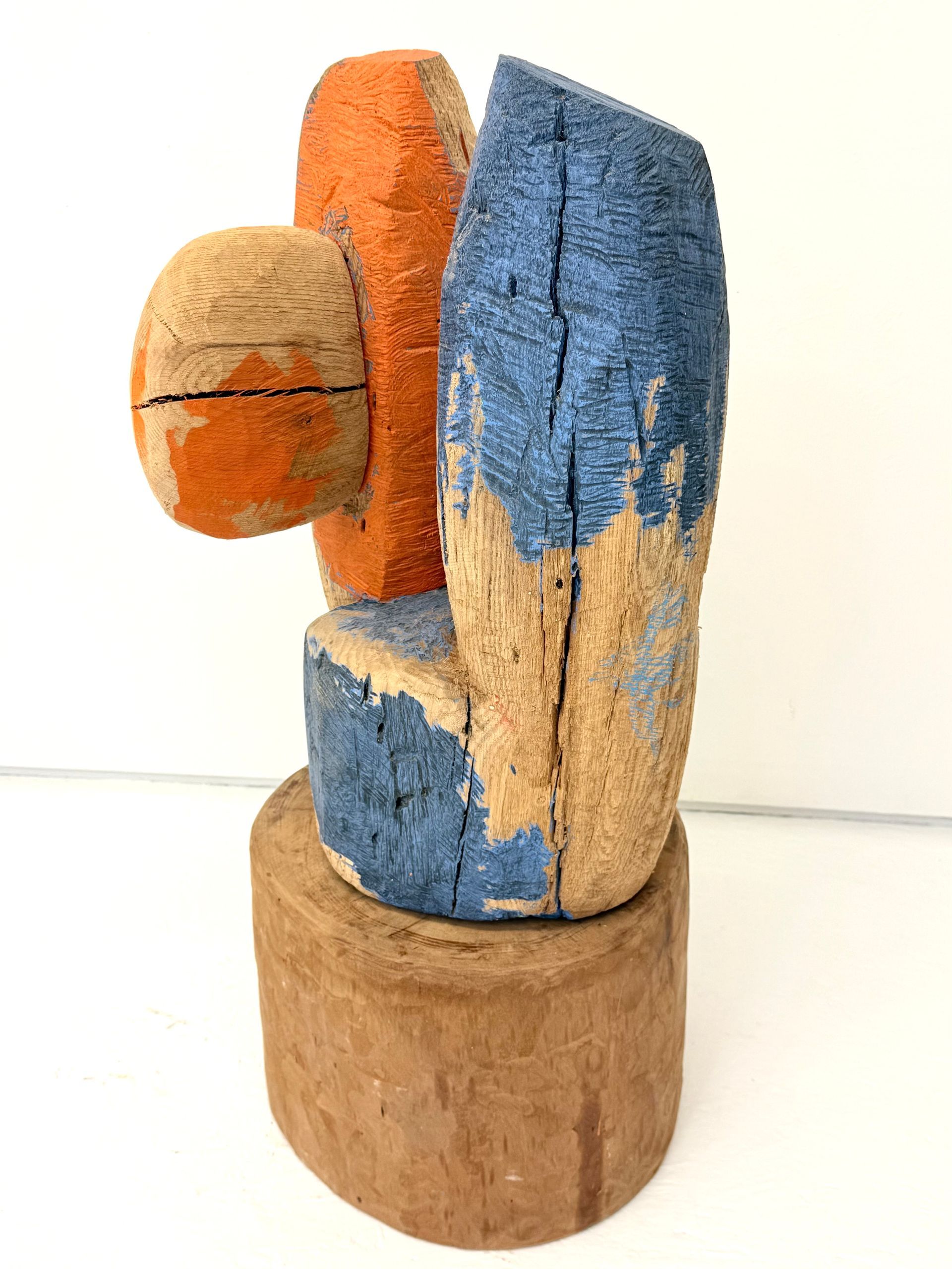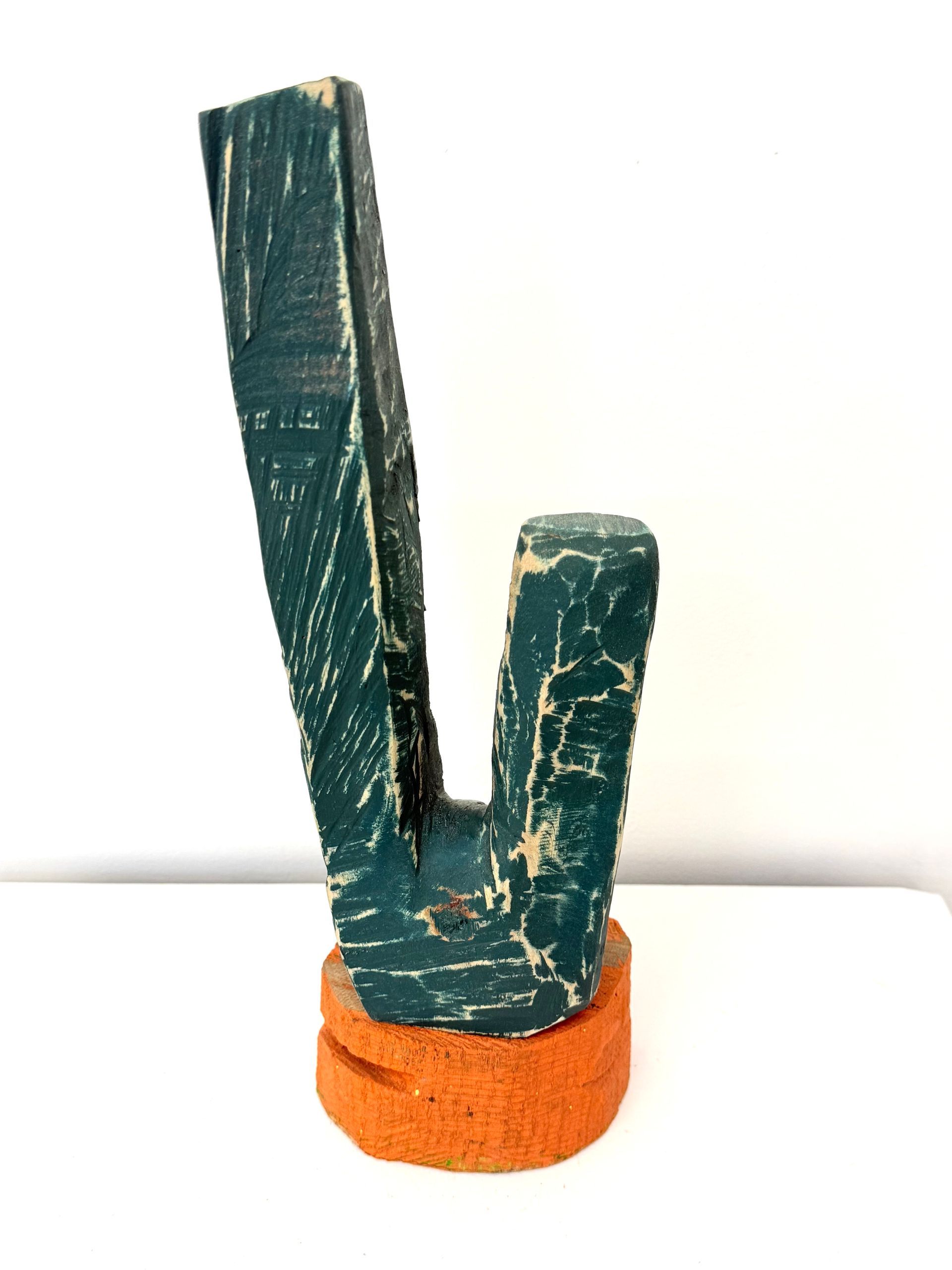 I’ve always liked to work with wood I’ve found—often pieces discarded by the roadside. There’s something compelling about their history: weathered, unpolished, marked by time and neglect. Their lack of preciousness invites a kind of freedom. I begin by reading the shape of the wood, allowing its irregularities to suggest a direction, carve into these cues, respond to them, sometimes resist them. I leave visible saw marks, scuffs, chalk outlines, layers of paint, allowing the surface to retain evidence of its making where color is an equal part of the structure.”