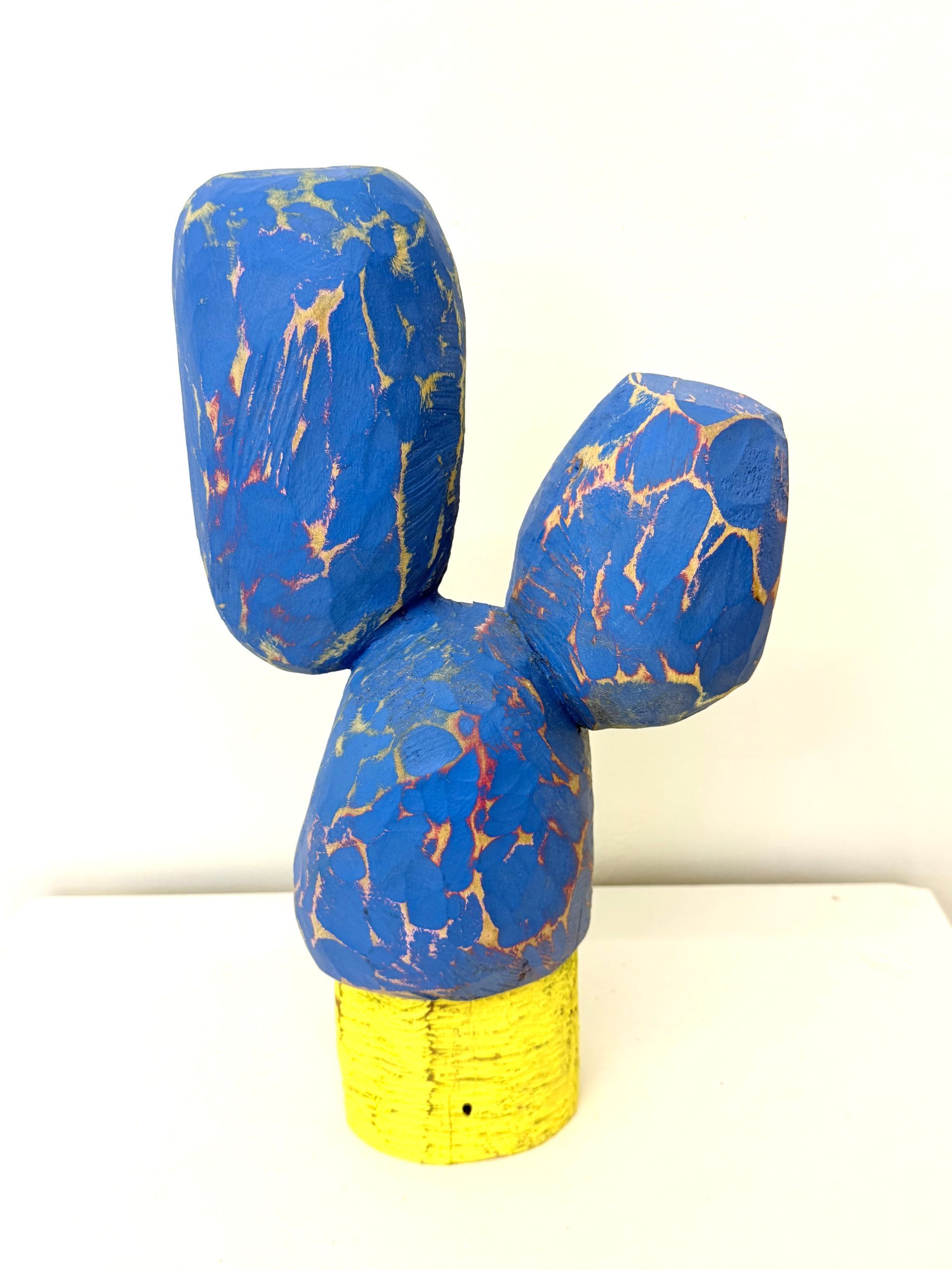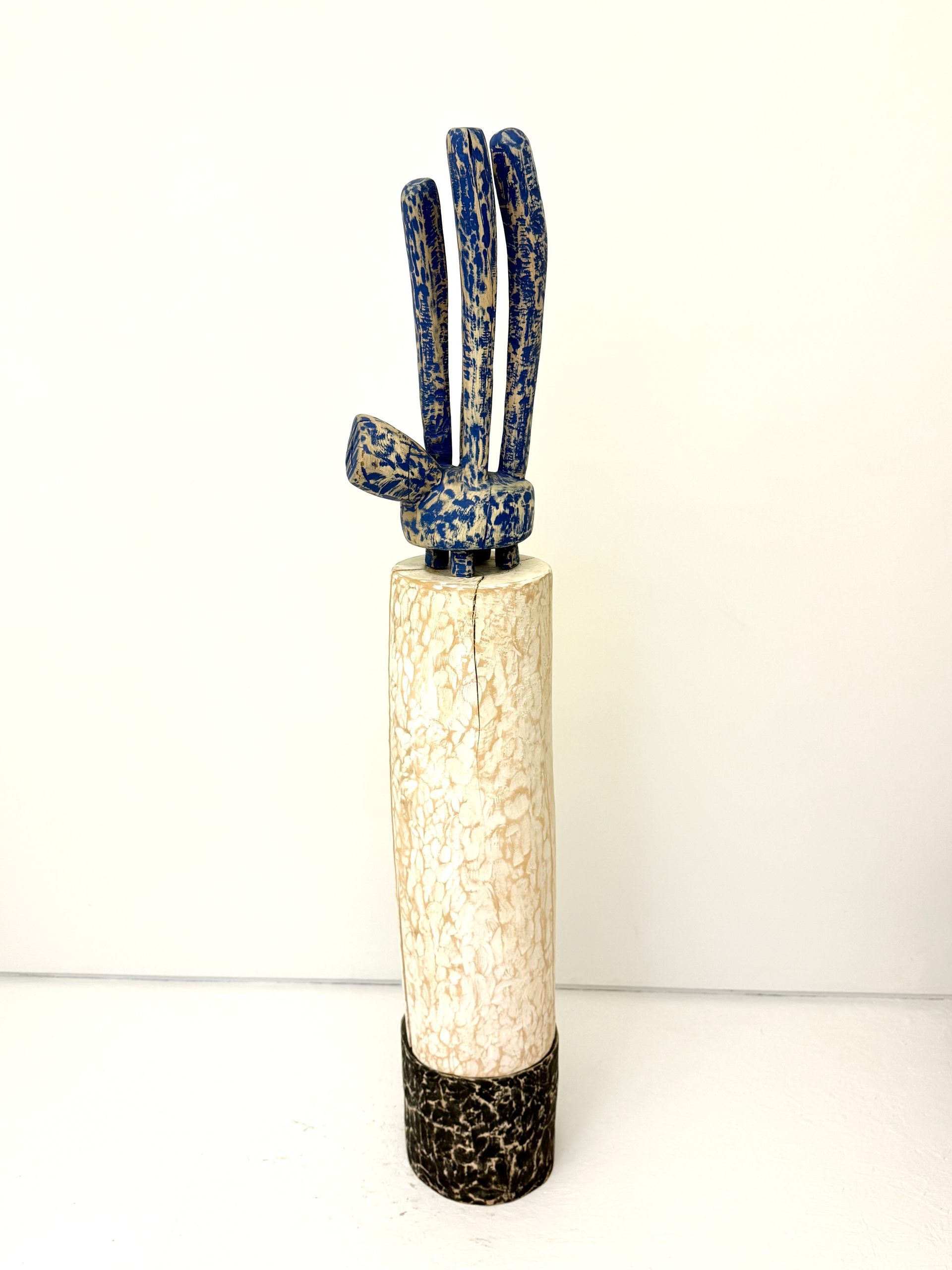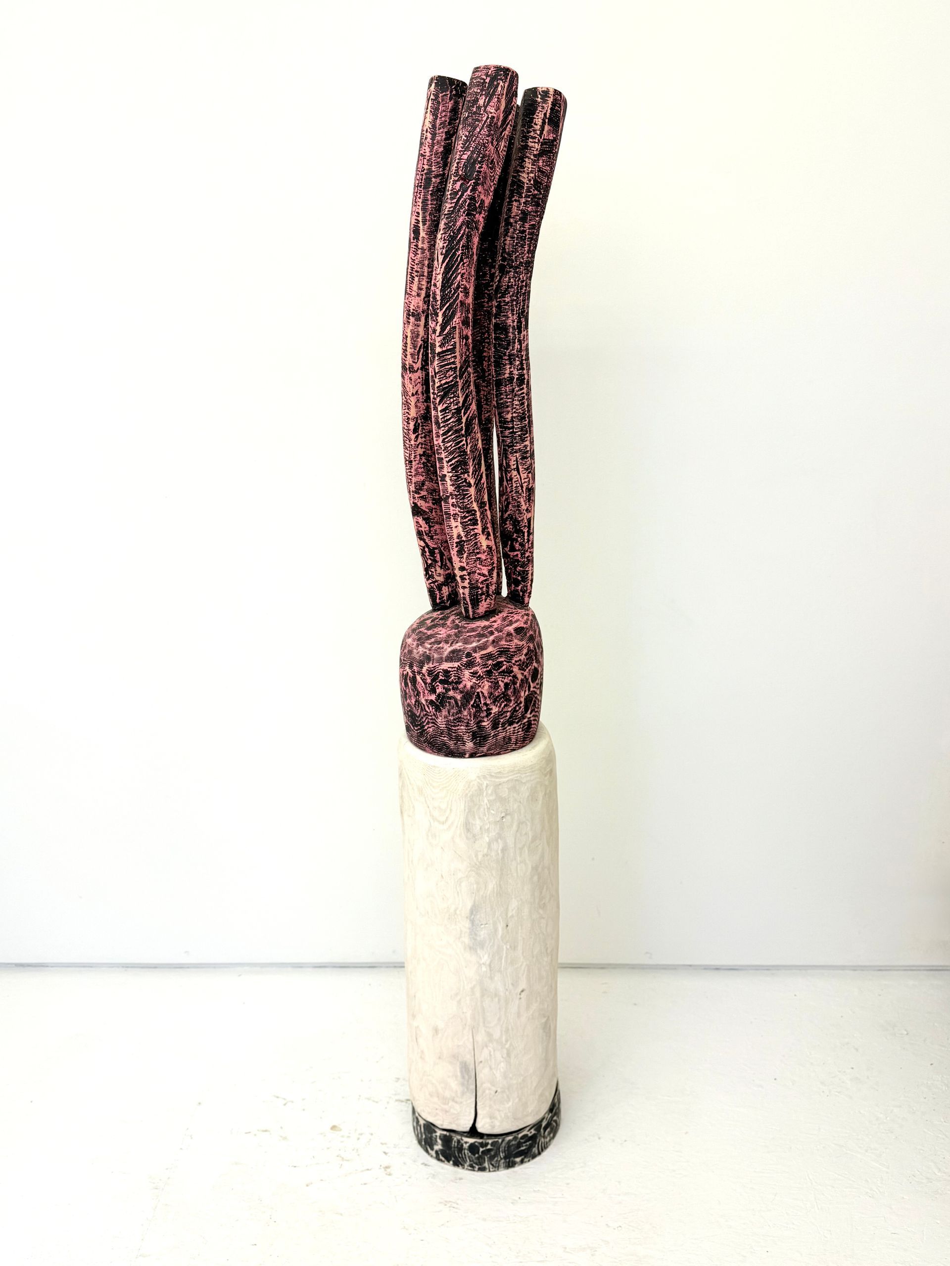 I’ve always liked to work with wood I’ve found—often pieces discarded by the roadside. There’s something compelling about their history: weathered, unpolished, marked by time and neglect. Their lack of preciousness invites a kind of freedom. I begin by reading the shape of the wood, allowing its irregularities to suggest a direction, carve into these cues, respond to them, sometimes resist them. I leave visible saw marks, scuffs, chalk outlines, layers of paint, allowing the surface to retain evidence of its making where color is an equal part of the structure.”